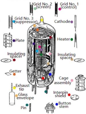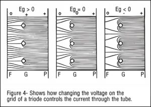 All modern vacuum tubes are based on the concept of the Audion–a heated “cathode” boils off electrons into a vacuum; they pass through a grid (or many grids), which control the electron current; the electrons then strike the anode (plate) and are absorbed. By designing the cathode, grid(s) and plate properly, the tube will make a small AC signal voltage into a larger AC voltage, thus amplifying it. (By comparison, today’s transistor makes use of electric fields in a crystal which has been specially processed–a much less obvious kind of amplifier, though much more important in today’s world.)