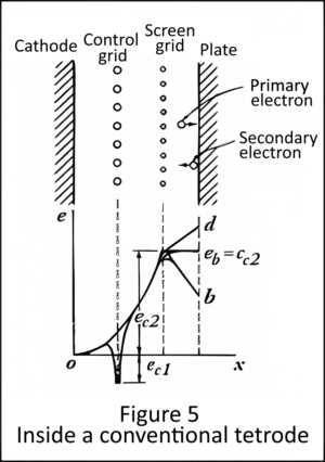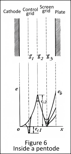 Adding another grid to a triode, between the control grid and the plate, makes it into a TETRODE. This “screen” grid helps screen, or isolate, the control grid from the plate. This is important is reducing the so-called Miller effect, which makes the capacitance between the grid and plate look much bigger than it really is. The screen also causes an electron-accelerating effect, increasing the tube’s gain dramatically. The screen grid in a power tube carries some current, which causes it to heat up. For this reason, screen grids are usually coated with graphite, to reduce secondary emission and help keep the control grid cool.